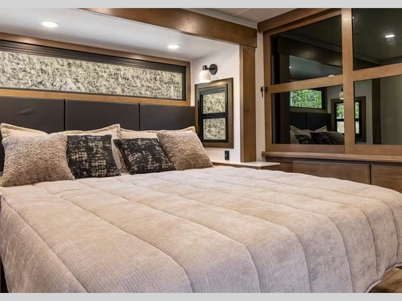 Sleeps 4 Slides 5 Length 42 ft 4 in Ext Height 13 ft 5 in Interior Color Oakmont Exterior Color Volcano, Cobalt, Sterling, Glacier Full-Body Paint Choices Hitch Weight 2975 lbs Dry Weight 15063 lbs Cargo Capacity 2937 lbs Fresh Water Capacity 70 gals Grey Water Capacity 88 gals Black Water Capacity 88 gals Tire Size 215/75R17.5H Furnace BTU 35000 btu Available Beds King Refrigerator Type Residential w/Ice Maker Refrigerator Size 18 cu ft Convection Cooking Yes Cooktop Burners 3 Shower Size 48" x 30" Number of Awnings 1 Axle Weight 7000 lbs LP Tank Capacity 30 lbs. AC BTU 45000 btu TV Info Smart HDTV; LR, BR Awning Info 19' Electric with LED Lights Axle Count 2 Washer/Dryer Available Yes Number of LP Tanks 2 Shower Type Standard Electrical Service 50 amp Similar Floorplans