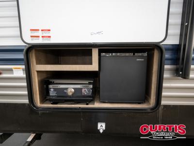 What could be better than camping with double-size bunks for guests? How about a front private bedroom for you, a full bath to clean up in, and a large slide out for maximum space! The chef of your group can prepare breakfast on the cooktop in the morning or use the microwave if you're on the go. There is a U-shaped dinette to dine at, or you can take your plate outdoors to sit under the power awning.
