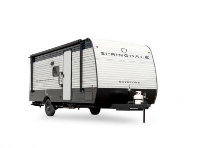 With any Springdale Mini travel trailer by Keystone, you will enjoy lightweight towing thanks to their single axle! The XL tinted safety glass windows are ultra durable, and the power awning will provide protection from the sun as you relax in your camp chairs outside. Each model includes blackout night shades, LED lighting, plus many more interior comforts. There is also a 20K BTU furnace to keep you comfortable, plus a tankless water heater for endless hot showers!