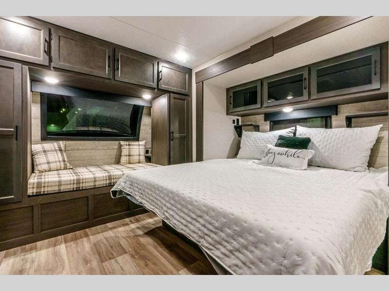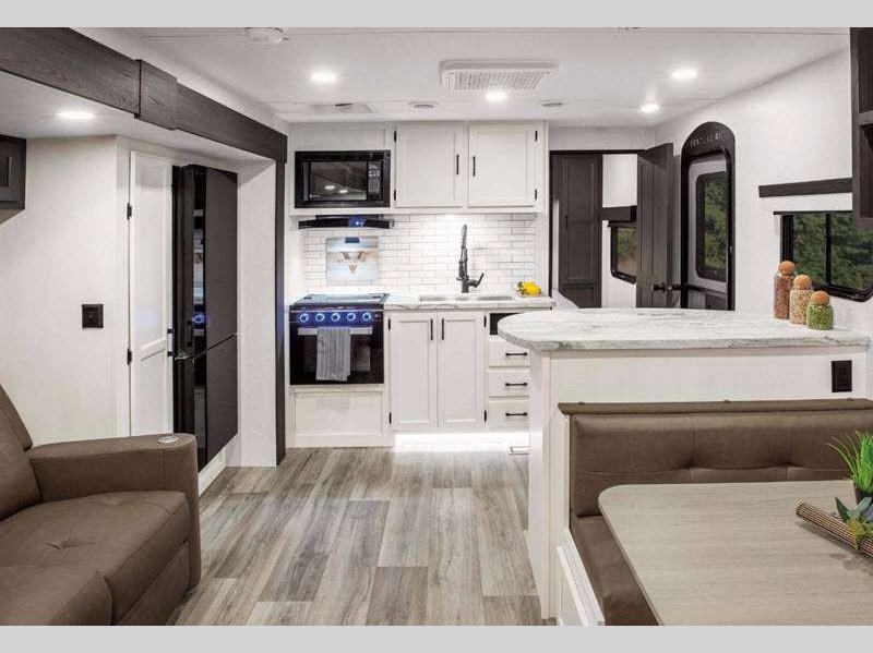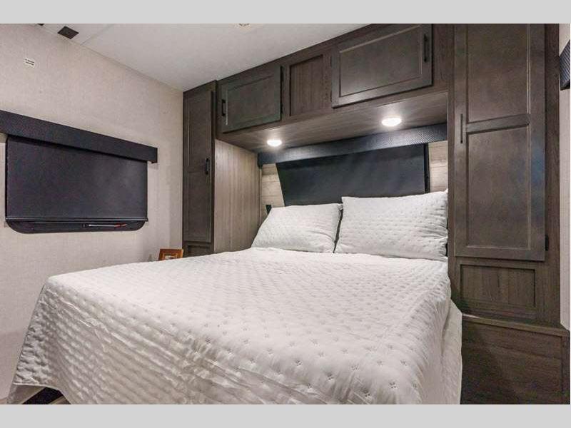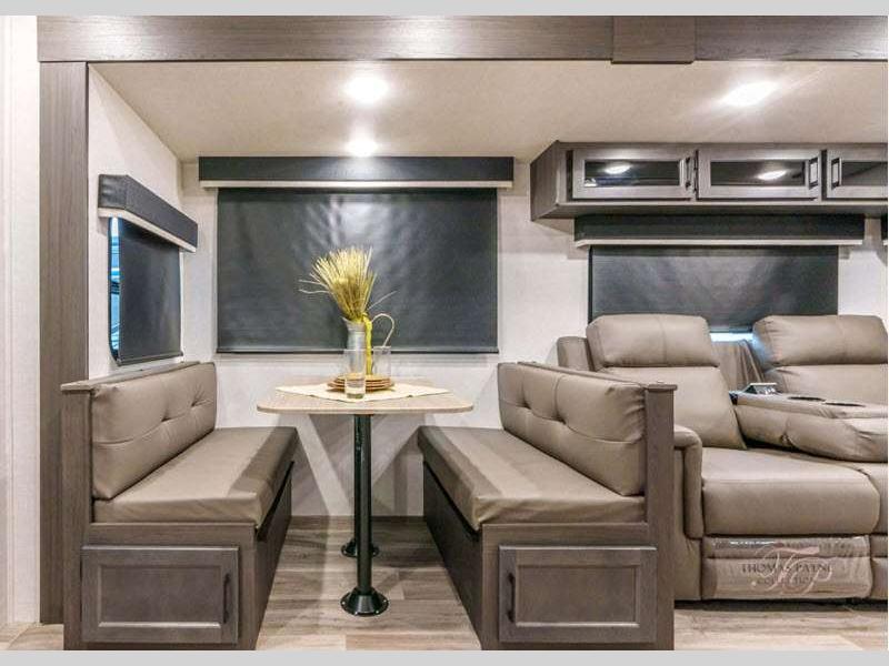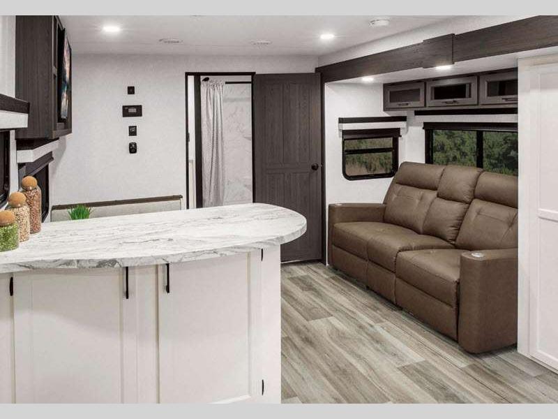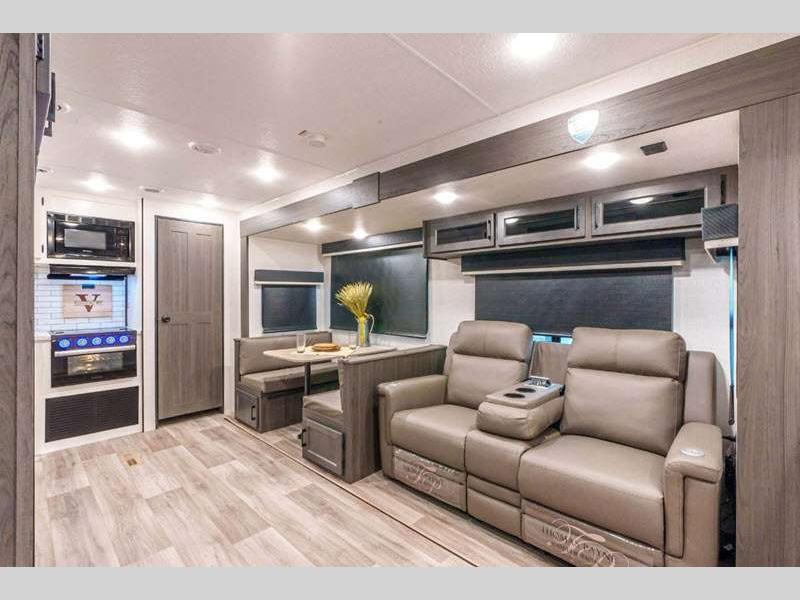 Sleeps 4 Slides 2 Length 34 ft 8 in Ext Width 8 ft Ext Height 11 ft 4 in Int Height 6 ft 10 in Interior Color Chestnut, Fawn, Sufside Maple, Teak Hitch Weight 990 lbs GVWR 9220 lbs Dry Weight 7860 lbs Cargo Capacity 1360 lbs Fresh Water Capacity 45 gals Grey Water Capacity 32 gals Black Water Capacity 32 gals Tire Size 15" Furnace BTU 30000 btu Available Beds Queen Refrigerator Type 12V Refrigerator Size 10 cu ft Cooktop Burners 3 Shower Size 34" Number of Awnings 1 Axle Weight 6870 lbs LP Tank Capacity 30 lbs Water Heater Type On demand tankless TV Info LR 40" TV with swing arm Awning Info 20' LED Power Axle Count 2 Number of LP Tanks 2 Shower Type Radius Electrical Service 50 amp Solar Wattage 200 watts Similar Floorplans