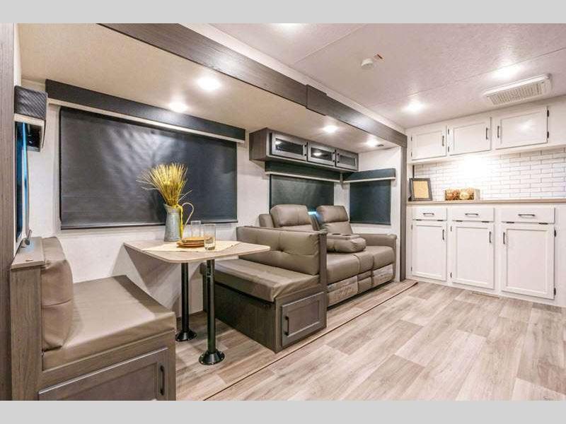 Sleeps 6 Slides 1 Length 33 ft Interior Color Chestnut, Fawn, Sufside Maple, Teak Hitch Weight 880 lbs GVWR 9240 lbs Dry Weight 6980 lbs Cargo Capacity 2260 lbs Fresh Water Capacity 45 gals Grey Water Capacity 32 gals Black Water Capacity 32 gals Tire Size 15" Number Of Bunks 2 Available Beds Queen Refrigerator Type 12V Refrigerator Size 10 cu ft Cooktop Burners 3 Shower Size 30" x 36" Number of Awnings 1 Axle Weight 6100 lbs LP Tank Capacity 30 lbs Water Heater Type Tankless on demand TV Info LR 50" TV on Lift Awning Info 21' LED Power Axle Count 2 Number of LP Tanks 2 Shower Type Standard Electrical Service 50 amp Solar Wattage 200 watts Similar Floorplans