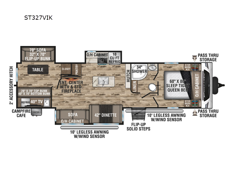 Stay protected rain or shine with the two 10' legless awnings with wind sensor on this travel trailer! Some other exterior features you will enjoy include a campfire café with a 38" TV to watch the big game while you grill steaks on the griddle, and the pass-through storage area with slam latch baggage doors will keep your gear in place. Inside there is a rear private bunkhouse with a closet, a 32" x 70" flip-up bunk above a 70" sofa with a table, and a 28" x 70" bunk above a 40" x 70" bottom bunk. The living area has a sofa across from an entertainment center with a 5,000 BTU frameless fireplace and a 40" TV with a swing arm so others can watch it from the 42" booth dinette. The dual entry bathroom has a 34" radius shower to freshen up in, and is easy to access, especially those staying in the front private bedroom!