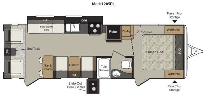 Single Slide Passport Trailer by Keystone, Rear Living w/2 Lounge Chairs & End Table, Fold-Down Sofa/Double Kitchen Sink & 3 Burner Range Slide, Refrig., Pantry, Bar w/Stools, Booth Dinette, Overhead Cabinets, Tub/Shower, Vanity & Sink, Front Queen Bed w/Wardrobes, TV Shelf, Private Bedroom Entrance, Pass-Thru Storage, Slideout Cook Center & More.