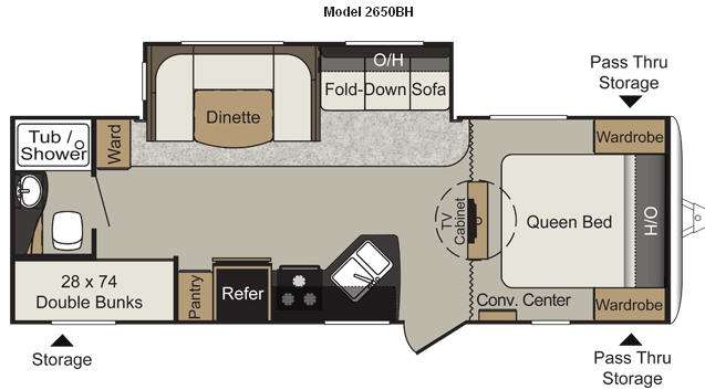 Passport Travel Trailer by Keystone RV w/Rear Corner Bath Including: Toilet, Sink & Tub/Shower, Rear Corner Bunk Beds, Wardrobe, U-Dinette & Fold-Down Sofa Slideout w/Overhead Cabinets, Pantry, Refrigerator, 3 Burner Range, Dbl. Kitchen Sink, Swivel TV Cabinet for Living Area & Bedroom Viewing, Front Queen Bed w/Wardrobes Both Sides of Bed, Conv. Center, Front Pass-Through Storage and Rear Exterior Storage and More!