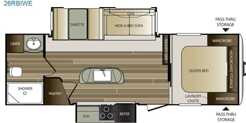 Step inside model 26RBIWE and enjoy the wide open concept feel with opposing slides fully extended. There is a front bedroom with queen bed including dual wardrobes, headboard storage, and a laundry chute for your dirty clothes.