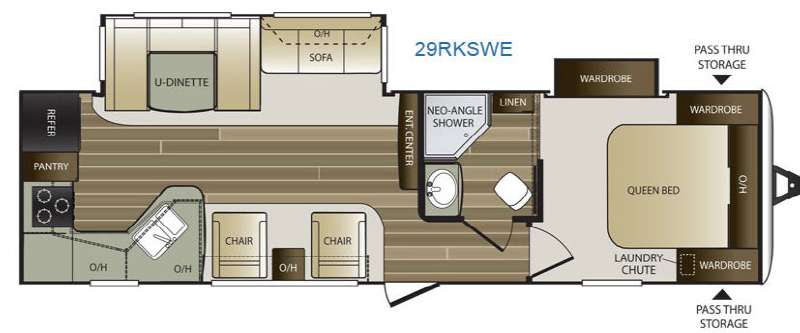 As you enter model 29RKSWE notice the convenient location of the complete bath which features a neo-angled shower, toilet, sink, and linen cabinet. There is also a second entry door for direct access into the front master bedroom.